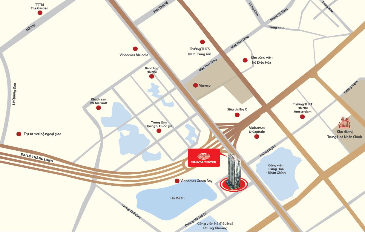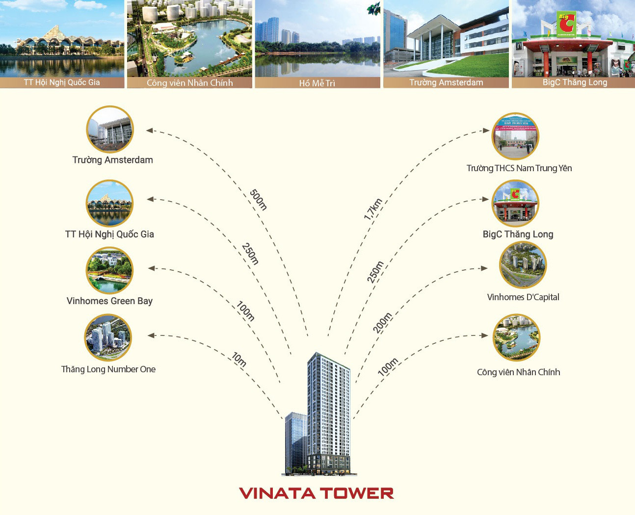 • Cư dân sống tại Vinata Tower sẽ dễ dàng liên kết với các trung tâm phát triển khác của Thủ đô Hà Nội qua các tuyến đường huyết mạch như: đường vành đai 3, đại lộ Thăng Long, Trần Duy Hưng, Lê Văn Lương,…